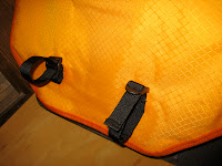 Attached at either end of the upper part of the bag are rather large side pockets. The one on the left is kind of normal, the one on the right has a little trick. It's mostly designed to be a place to keep dirty laundry, wet clothes, shoes, or other things you might not want getting shoved in with all your nice clean clothes in the main part of the bag. The pocket actually goes much deeper than it appears -- it has a sort of sock-like shape to it that extends into the main compartment. This has advantages and disadvantages: if you don't need to fill that pocket with much, then it just compresses and doesn't take away valuable space in the main compartment. If you do try to cram it with stuff, it will expand into the main compartment, giving you less room in there. I think this is the best possible solution, but when I've got close to a week of dirty laundry, it can be tricky to shove it all in the side pouch, and then rearrange the rest of my bag to compensate for the fact that the center compartment is now reduced in capacity for clean clothes. In theory it should all work out because it's the same total volume, but I find I always have to start rearranging things as the proportion of dirty vs. clean clothes changes throughout the week. If you stay somewhere more than a day or two and actually fully unpack your bag in the hotel, it might not matter at all. Anyway, the idea of having a separate place for dirty laundry was a huge selling point for this bag. The fact that it doesn't waste space when empty is also highly awesome.